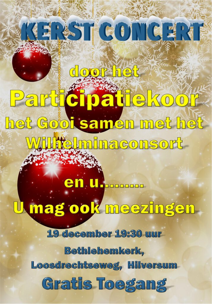 Op vrijdag 19 december geeft HET PARTICIPATIEKOOR het Gooi een kerstconcert. Muziek van Vivaldi, Corelli, enz. en natuur;lijk alle bekende Carols om mee te zingen. Welkom